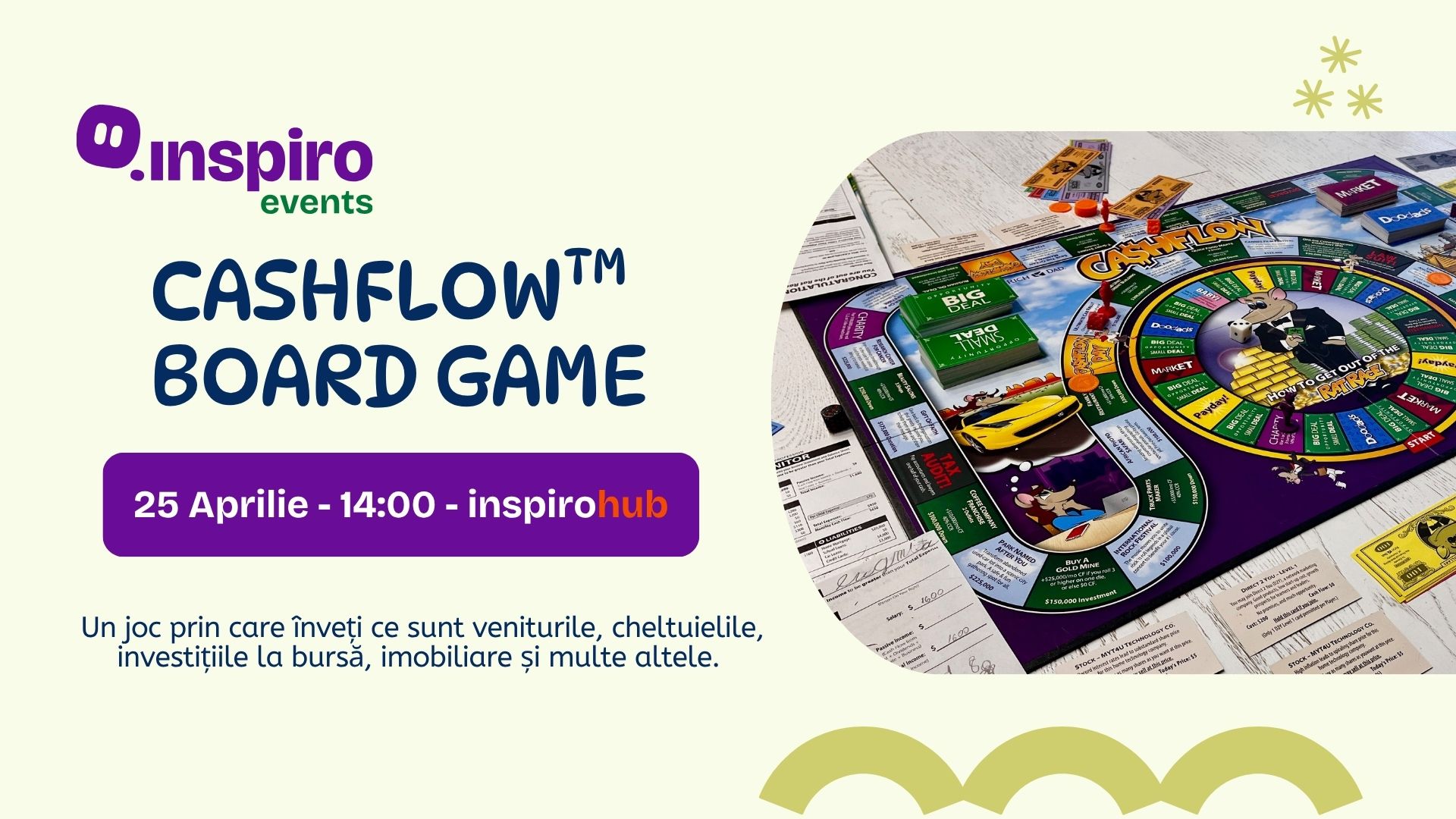 Vino să joci CASHFLOW, celebrul board game creat de Robert Kiyosaki, autorul bestseller-ului "Rich Dad, Poor Dad". Prin joc, cea mai puternică metodă de învățare, vei afla lecții esențiale despre cum funcționează banii în viața reală - lecții pe care sistemul educațional românesc nu ți le predă.